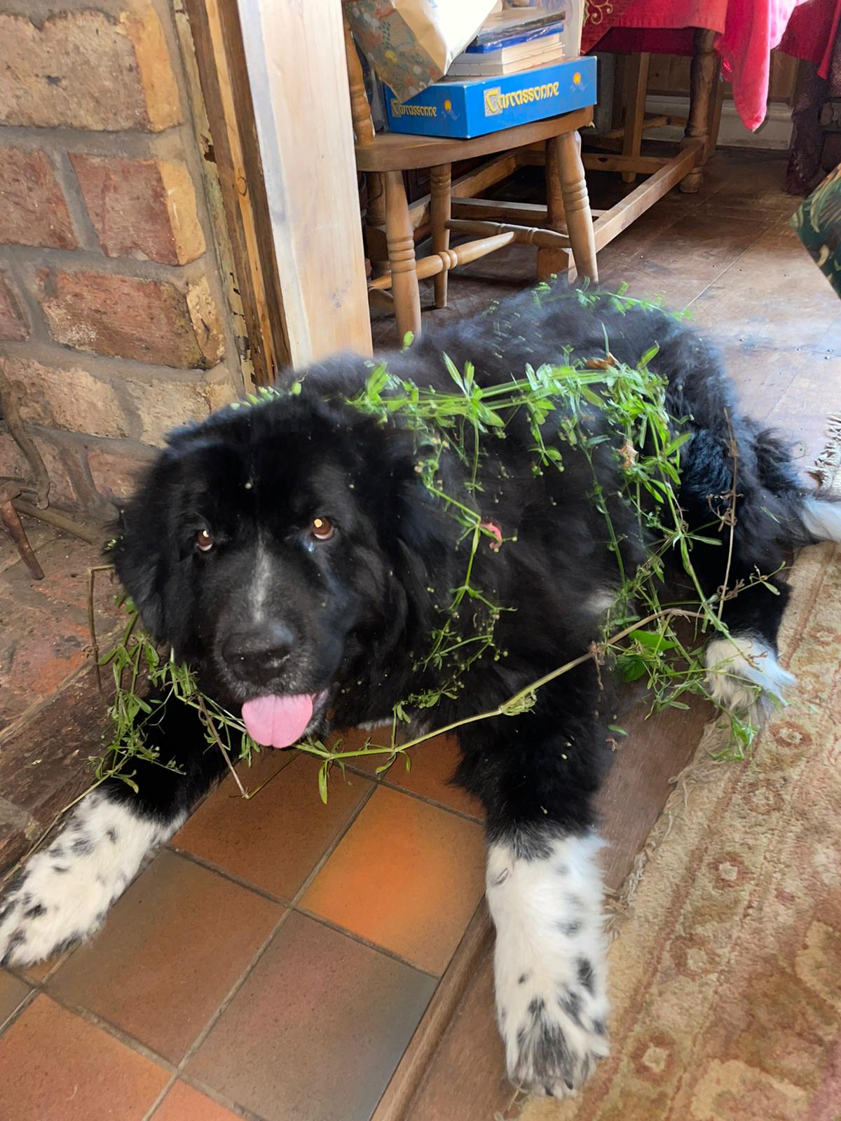 Purdy is 60kg of cuddly Newfoundland or ‘Newfie’, for short. She is aware that you should not sit still for the whole day when working from home. Here, she enjoyed the garden so much when she went for some exercise, that she brought a fair amount of it with her.