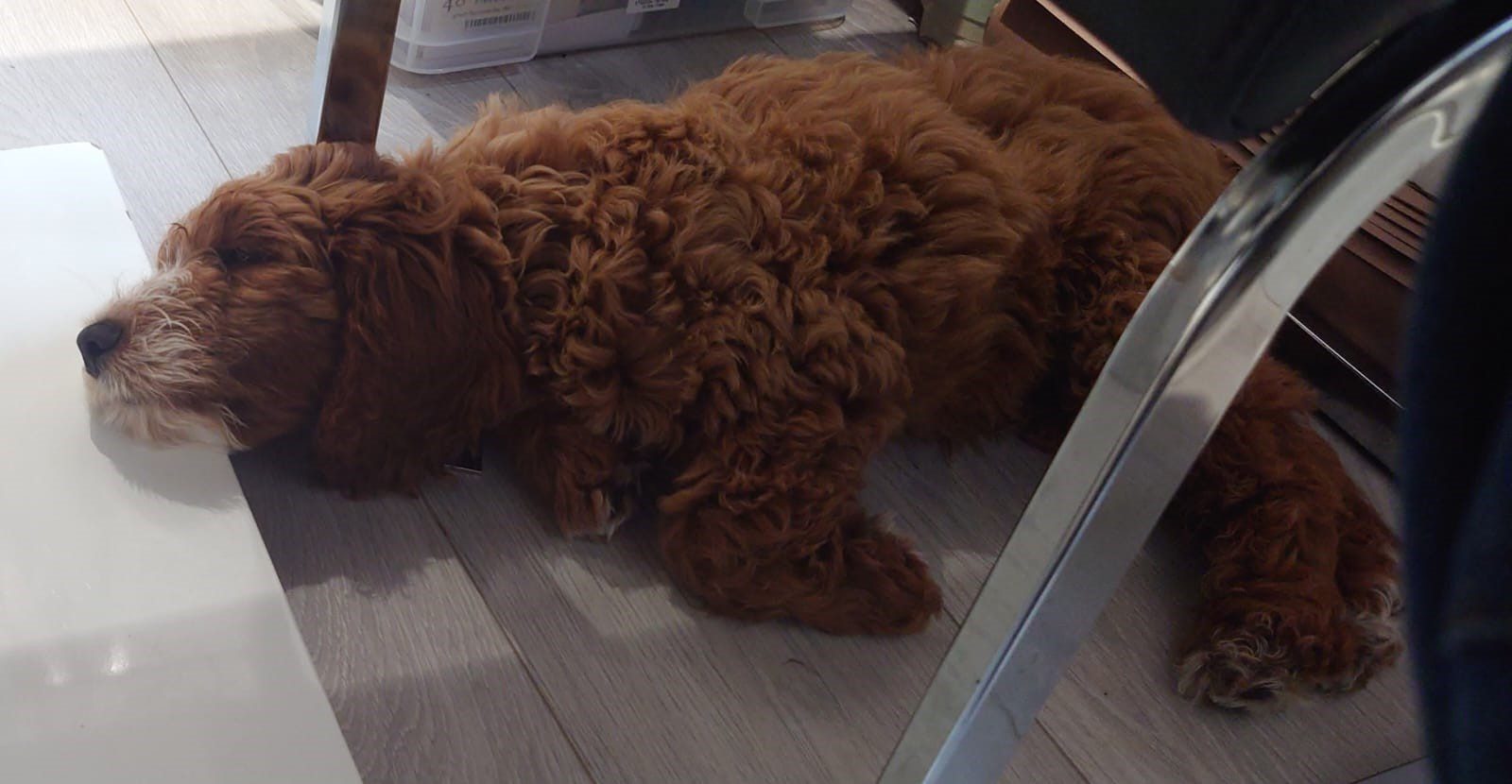 Timmy is a Cockerpoo and the youngest member of the support team. Here he assumes his normal working day position under the table. Look at him go!
